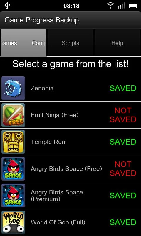 Game Progress Backup. Aplikasi yang satu ini dibuat khusus hanya untuk menyimpan atau save data game untuk pengguna Android yang tidak melakukan root terhapad Smartphone dan Tablet. Aplikasi ini secara otomatis akan menunjukkan daftar game yang telah terpasang di Android kita dan hanya sekali tap, maka data game pun tersimpan. Sayangnya, aplikasi ini masih BETA sehingga masih terbatasnya game yang bisa disimpan. Tetapi permain yang sudah populer bisa disimpan datanya dengan aplikasi ini.