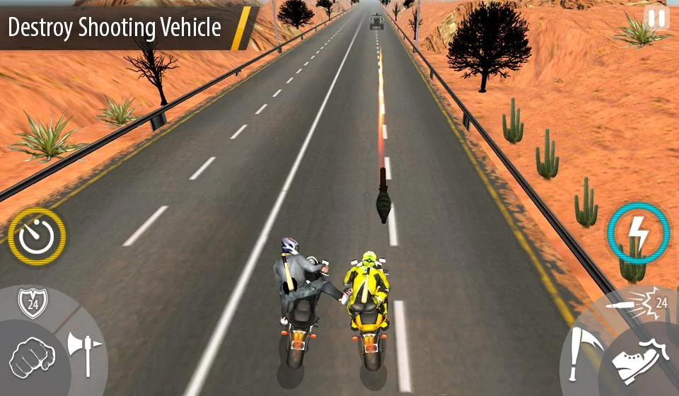 Bike Attack Race is distinguished from other bike racing plus shooting games simulators by a faithful reproduction of tactical maneuvers of bike driving on detailed tracks and bike control as well as various other shooting facets than when compared to other bike racing games.